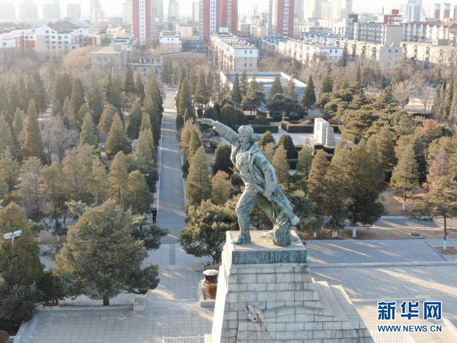 2月2日拍攝的遼沈戰(zhàn)役烈士紀(jì)念塔上的英烈銅像(無人機(jī)照片)。新華社記者 楊青 攝