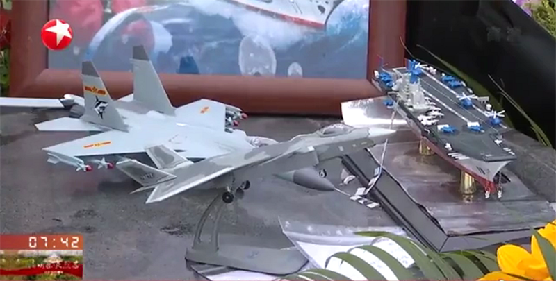 擺放在王偉墓前的戰(zhàn)機(jī)和航母模型。圖片來(lái)自網(wǎng)絡(luò)