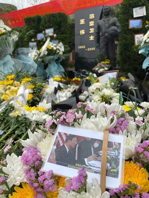 浙江安賢陵園。今年的4月1日是烈士王偉犧牲20周年。陵園工作人員稱,3月30日起王偉烈士墓前除了好多好多鮮花,還多了“殲15”和航母模型。這好多的鮮花,有的是附近民眾自發(fā)祭奠王偉時(shí)留下的,還有不少是外地民眾托快遞小哥送來(lái)的。