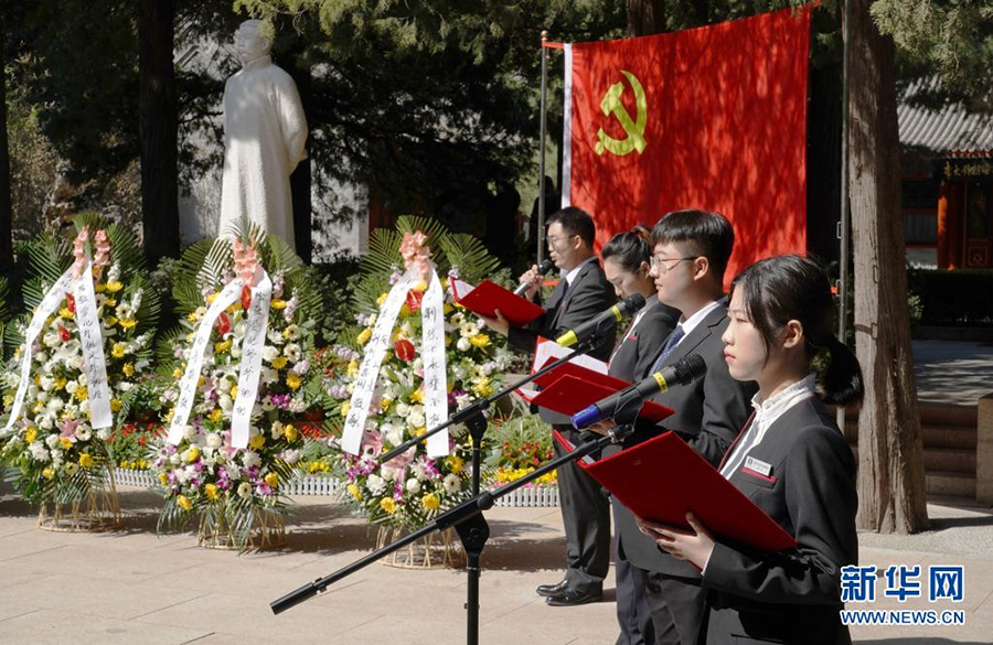 4月4日,在北京市萬(wàn)安公墓內(nèi)的李大釗烈士陵園,工作人員在“緬懷革命先烈 傳承紅色基因”清明共祭活動(dòng)中表演情景朗誦《李大釗的青春人生》。新華社記者 任超 攝