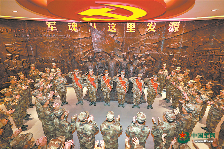 “軍魂從這里發(fā)源”主題雕塑前,第83集團(tuán)軍某旅“紅一連”組織優(yōu)秀共產(chǎn)黨員評(píng)選活動(dòng)。 張?jiān)鰩r攝