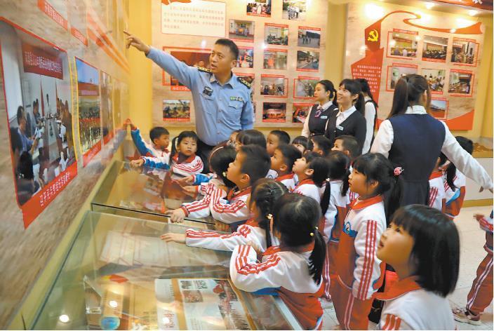 四月上旬,廣東省南澳縣人武部依托部史館開展青少年國防教育。圖為人武部領(lǐng)導(dǎo)向小學(xué)生講解部隊官兵的戍島歷史。陳建文攝