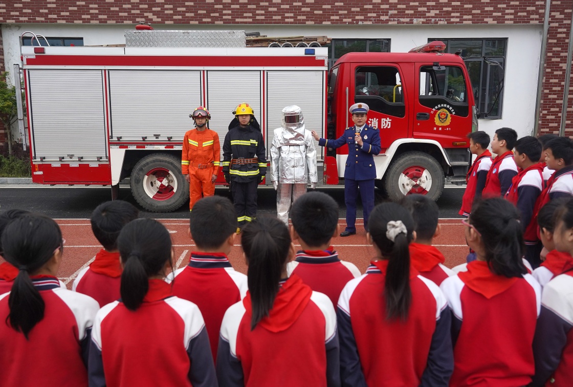 4月14日,消防工作人員向?yàn)忱镂逍〉膶W(xué)生們介紹消防知識(shí)。新華社記者 萬象 攝