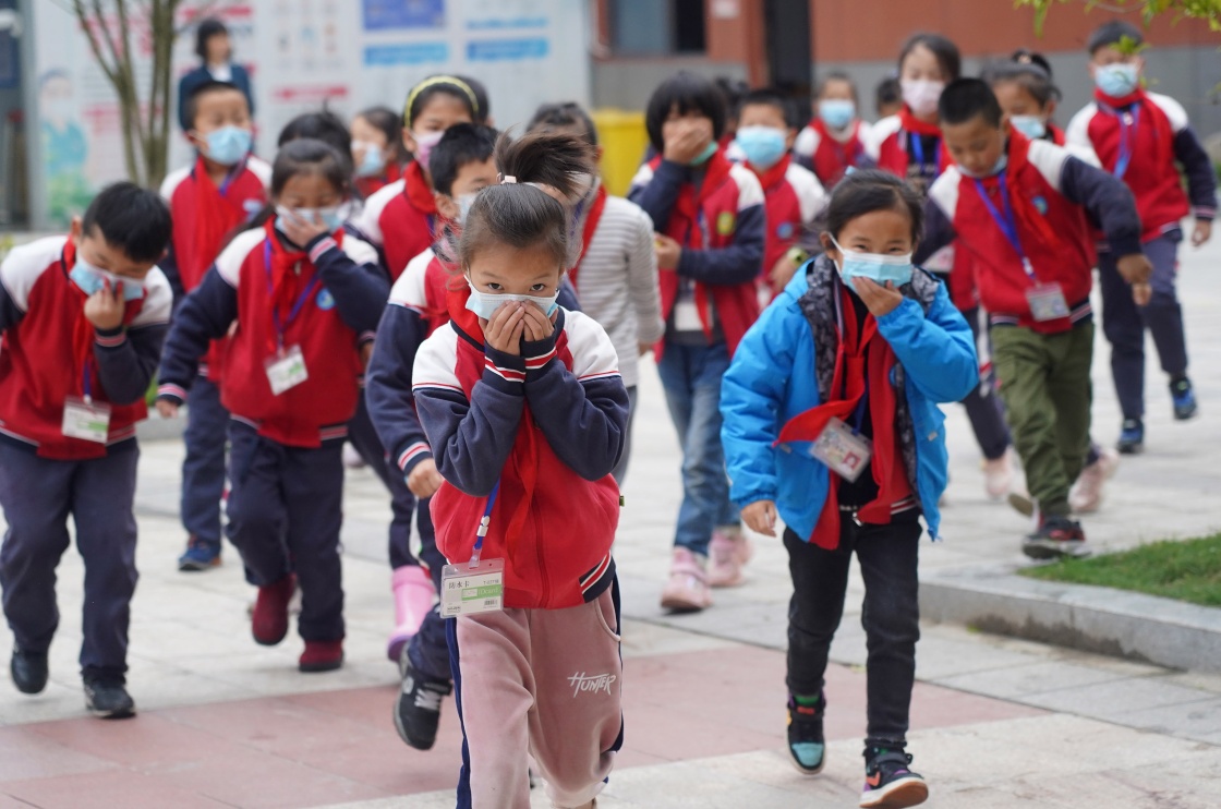 4月14日,灣里五小的學(xué)生們在老師的組織下進(jìn)行應(yīng)急避險(xiǎn)演練。新華社記者 萬象 攝