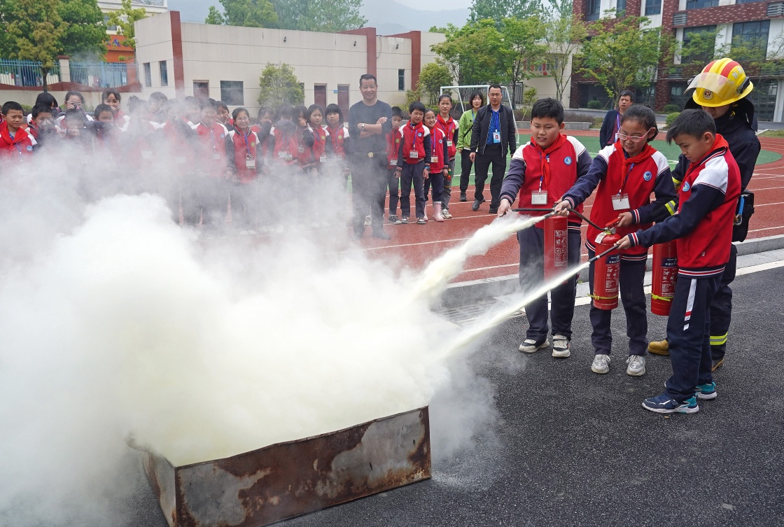 4月14日,灣里五小的學(xué)生在消防員的指導(dǎo)下學(xué)習(xí)使用滅火器滅火。新華社記者 萬象 攝
