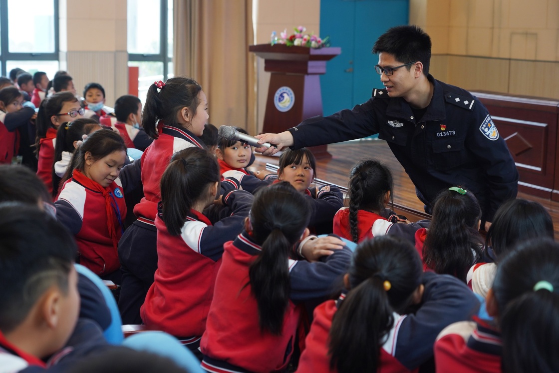 4月14日,警官就國家安全相關(guān)知識(shí)與灣里五小的學(xué)生進(jìn)行互動(dòng)。新華社記者 萬象 攝