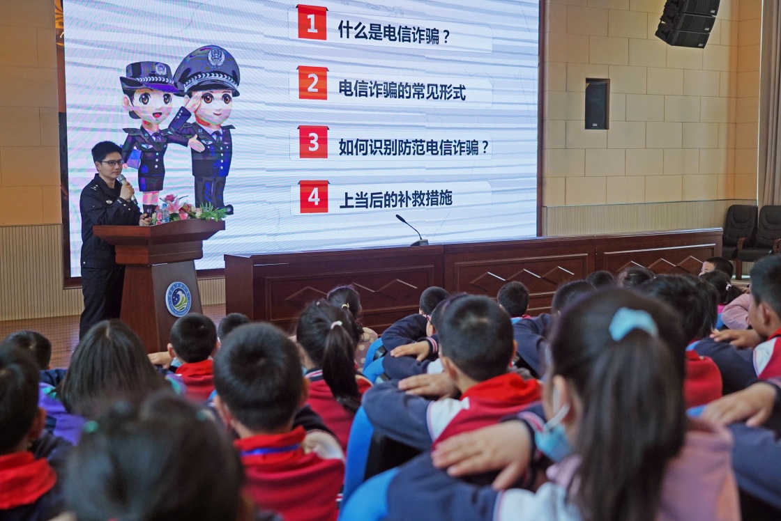4月14日,警官向?yàn)忱镂逍〉膶W(xué)生們講解預(yù)防電信詐騙的相關(guān)知識(shí)。新華社記者 萬象 攝