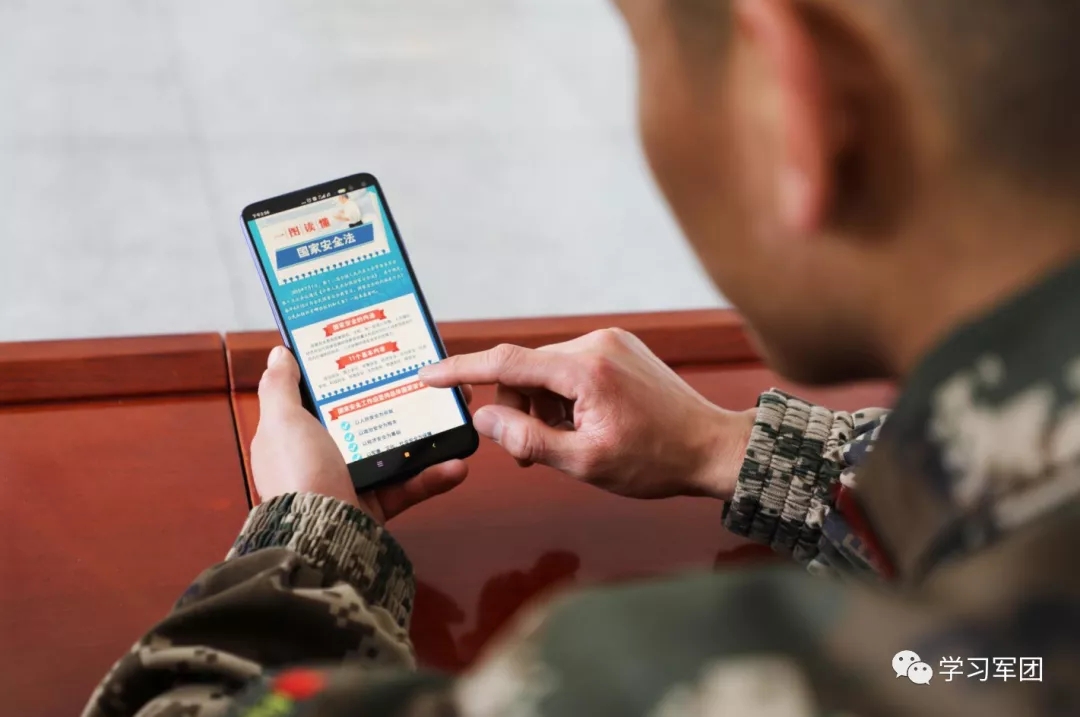 ▲武警甘肅總隊(duì)機(jī)動(dòng)支隊(duì)官兵通過手機(jī)自學(xué)國家安全知識(shí)