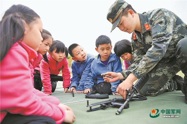 在第六個(gè)全民國家安全教育日來臨之際,武警安徽總隊(duì)合肥支隊(duì)執(zhí)勤一大隊(duì)組織開展軍營開放日活動。圖為戰(zhàn)士講解武器分解結(jié)合。徐 偉攝