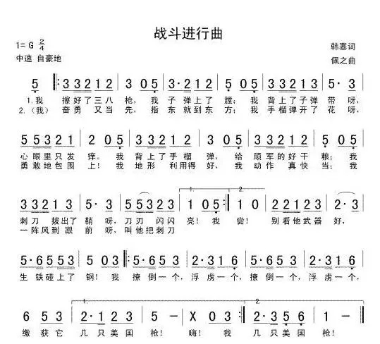 “我擦好了三八槍,我子彈上了膛……”這首名為《戰(zhàn)斗進(jìn)行曲》的軍歌創(chuàng)作于解放戰(zhàn)爭(zhēng)初期,作詞韓塞,作曲佩之(原名王佩之),這首歌唱出了中國(guó)人民解放軍廣大指戰(zhàn)員藐視敵人,對(duì)勝利充滿信心的豪情,廣為傳唱至今。