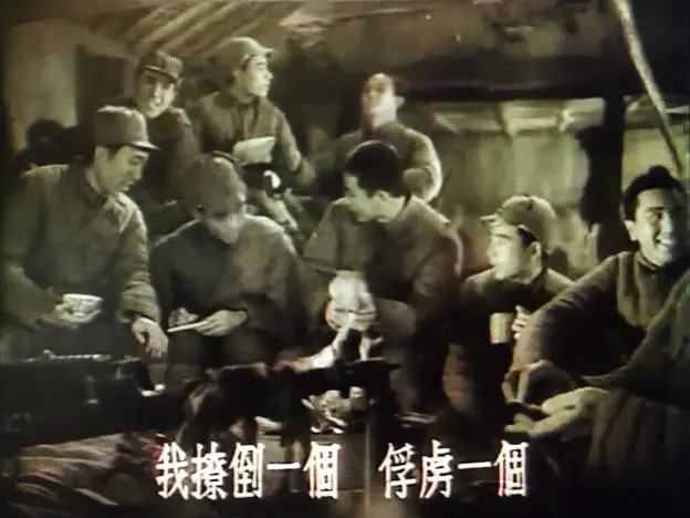 電影《戰(zhàn)火中的青春》里解放軍英雄排高唱《戰(zhàn)斗進(jìn)行曲》