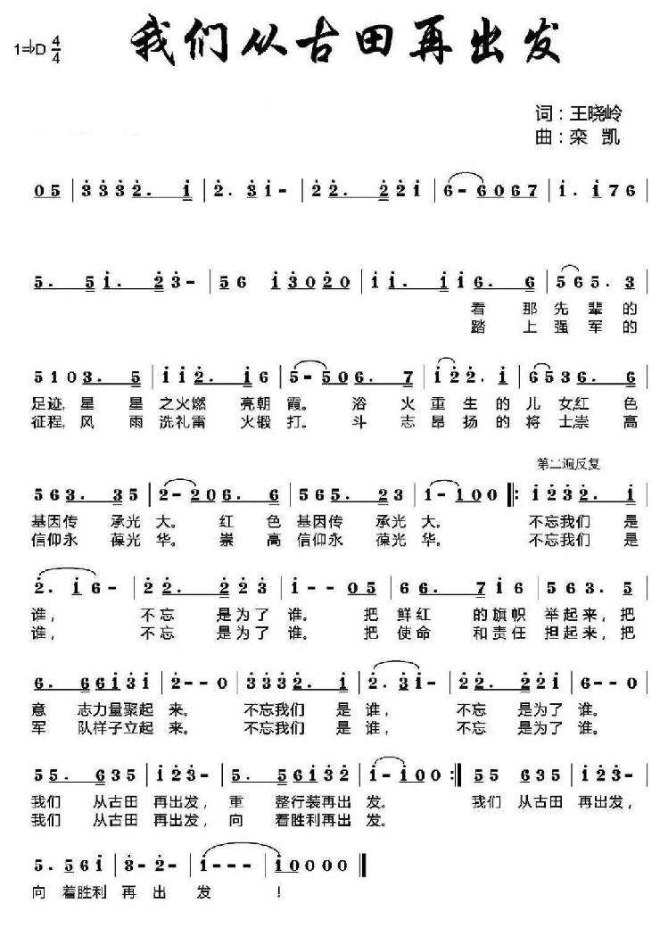 2015年1月,根據(jù)全軍政治工作會(huì)議精神,創(chuàng)作了歌曲《我們從古田再出發(fā)》,王曉嶺作詞,欒凱作曲,閻維文演唱。歌曲曲調(diào)鏗鏘激昂,歌詞寓意鮮明,生動(dòng)地表達(dá)了全軍官兵堅(jiān)決聽黨指揮,不忘初心、牢記使命,向著勝利再出發(fā)的強(qiáng)軍信念和精神風(fēng)貌。