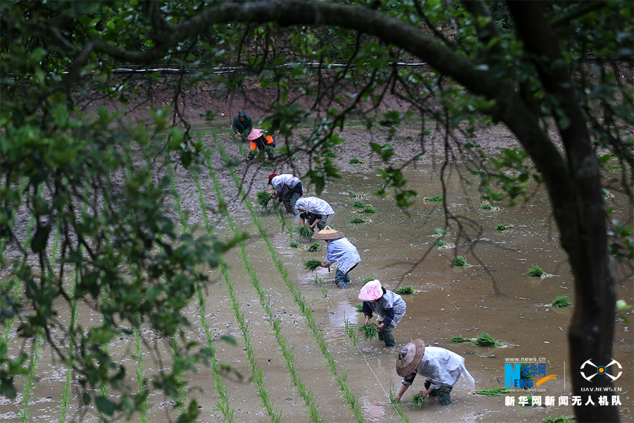 大坪村村民在稻魚共生基地插秧。新華網(wǎng)發(fā)(楊敏 攝)