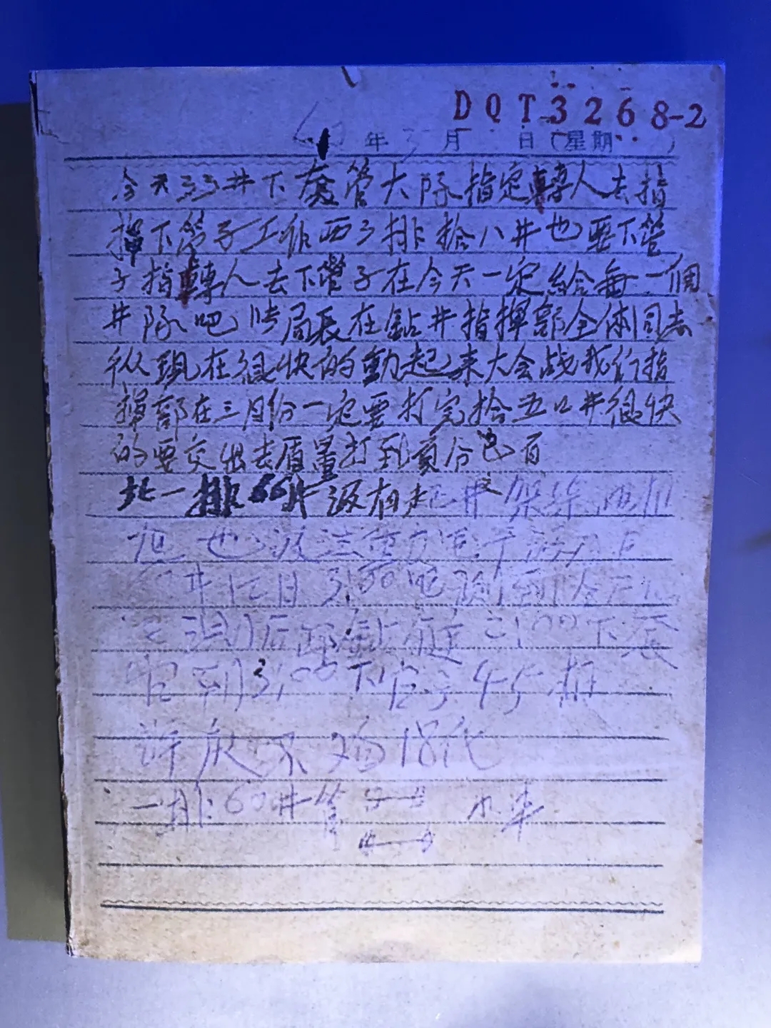 石油大會(huì)戰(zhàn)時(shí)期,“鐵人”王進(jìn)喜在日記中寫道:我們指揮部在三月份一定要完成15口井,很快的要交出去,質(zhì)量打到百分百