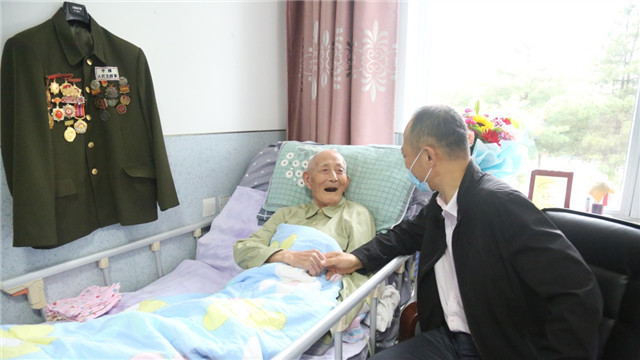 6月1日,抗美援朝老戰(zhàn)士孫景坤在丹東光榮院與院長(zhǎng)交談。新華社發(fā)