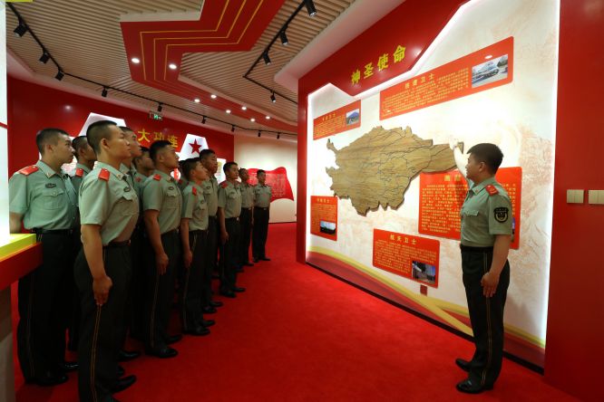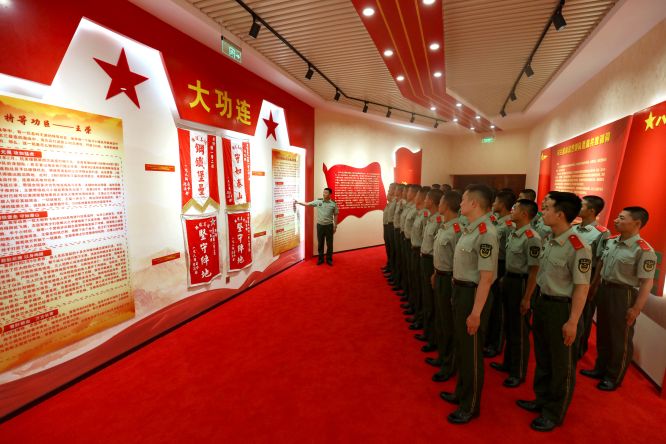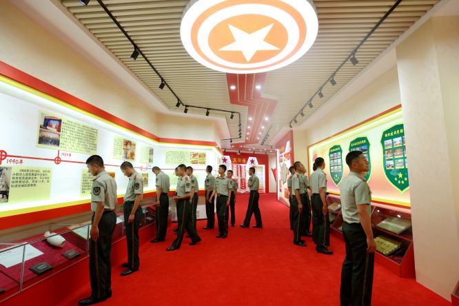 一幅幅泛黃的歷史照片,一面面功勛卓著的榮譽戰(zhàn)旗,一組組蘊含深意的造型陳列,都在述說著支隊經歲月而彌新、歷滄桑而雄渾的紅色根脈。該支隊按照“莊重大氣、簡潔實用、內涵豐富、富有特色”的原則,結合機關營院整體布局因地制宜,在官兵養(yǎng)成路兩側及禮堂、中心花園等區(qū)域,按照基因紅、橄欖綠、建筑灰、大地黃為基本色調,以墻、道、林、場、園和廊為基本構成,共設“旗幟引領”“光輝歷程”“勝戰(zhàn)廣場”“精銳長廊”“鑄盾揚威”五個單元,采取浮雕、油畫、櫥窗、LED電子屏等形式,用直觀性、教育性、指導性的文字、圖片、視頻影像將部隊創(chuàng)業(yè)史、奮斗史,直觀立體地展現(xiàn)出來。