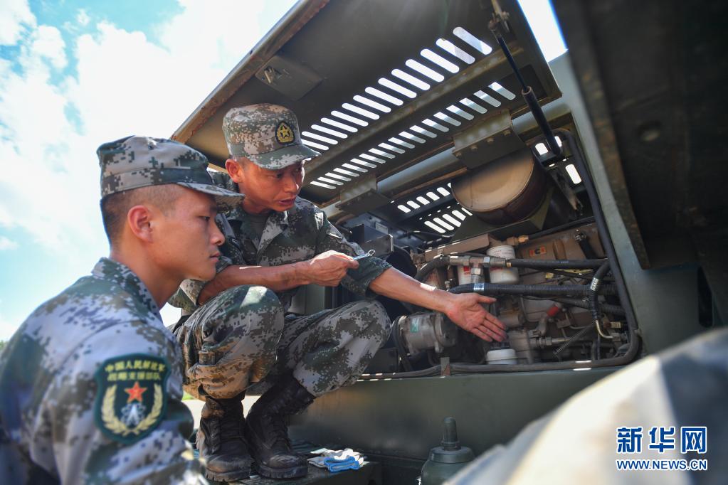 戰(zhàn)略支援部隊某大隊一級軍士長高玉華(右)演示操作要領(lǐng)(7月23日攝)。 新華社記者 陳澤國 攝