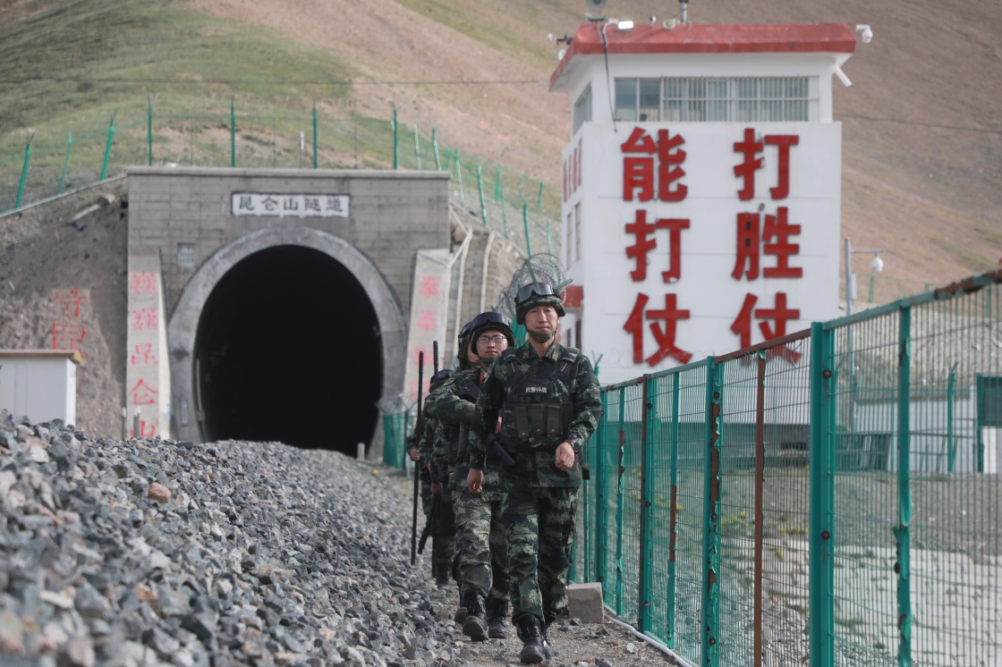 楊富祥(前)和戰(zhàn)友在昆侖山隧道沿線巡邏(7月27日攝)。新華社發(fā)(楊浩 攝)