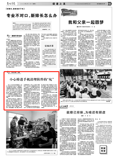 戰(zhàn)士小于在用手機看新聞、小說時,總是會收到“內(nèi)存不足”“病毒文件”“垃圾清理”等“安全提示”,他根據(jù)提示下載清理軟件清理手機后,卻發(fā)現(xiàn)“安全提示”越來越多,手機也越來越“卡”。此外,小于還發(fā)現(xiàn),手機里還經(jīng)常出現(xiàn)一些不明來路的廣告,如簽到搶紅包、瀏覽賺金幣、走路換積分等等。