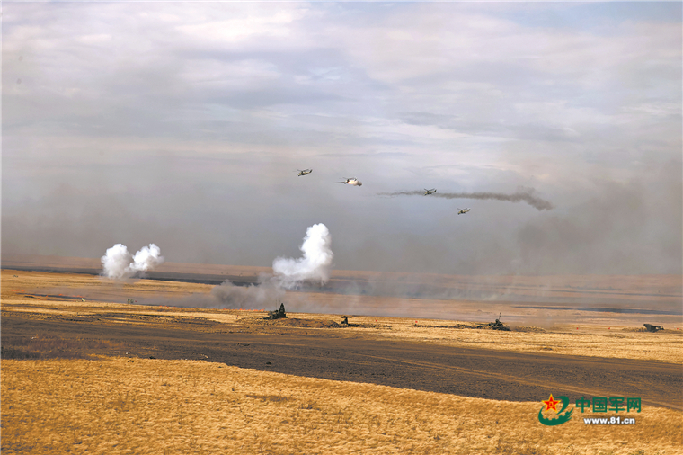 9月15日,在實(shí)彈演練中,各國參演部隊(duì)陸空一體對“敵”實(shí)施火力打擊。仲崇嶺攝