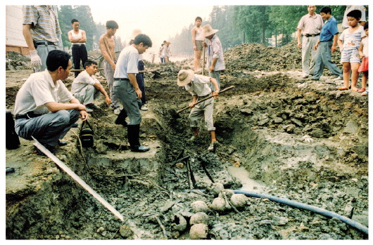 1998年8月18日,在一處建筑工地深挖過程中,意外挖出41個人頭骨和大量肢骨,現(xiàn)場散發(fā)刺鼻氣味。侵華日軍南京大屠殺遇難同胞紀念館時任館長朱成山,當時正在外地出差,一通電話后,他立即趕回南京。