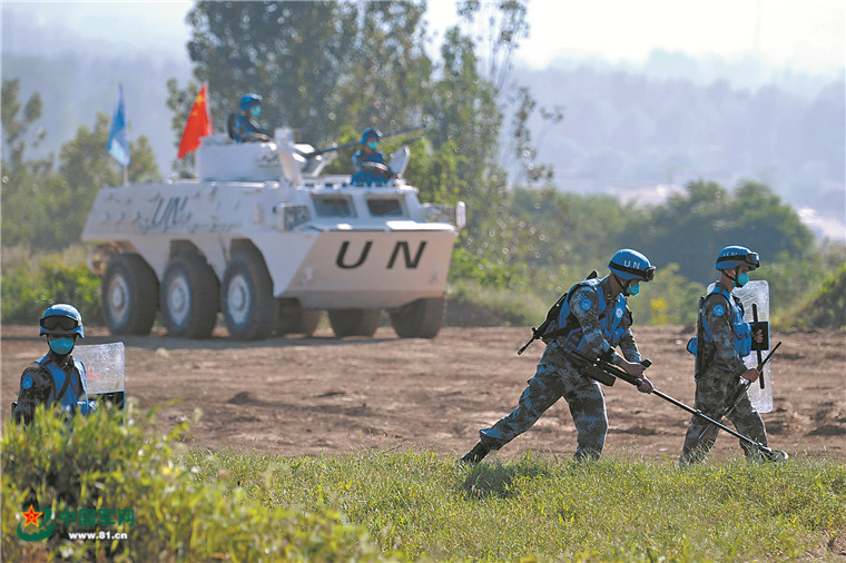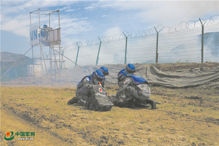 中國(guó)參演官兵在保護(hù)平民課目演練中清查周邊場(chǎng)地。