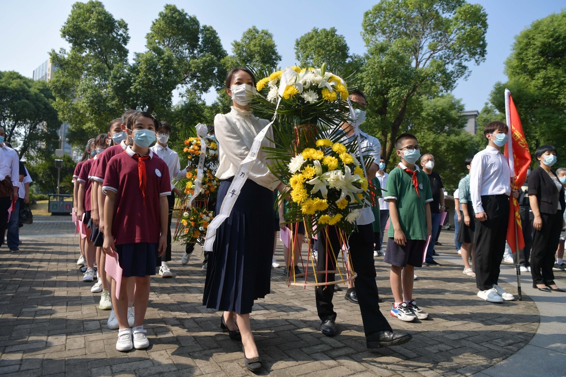 9月18日,在江西省南昌市新四軍軍部舊址陳列館紀念廣場,參加紀念九一八事變爆發(fā)90周年活動的各界人士向革命先輩雕像敬獻花籃。