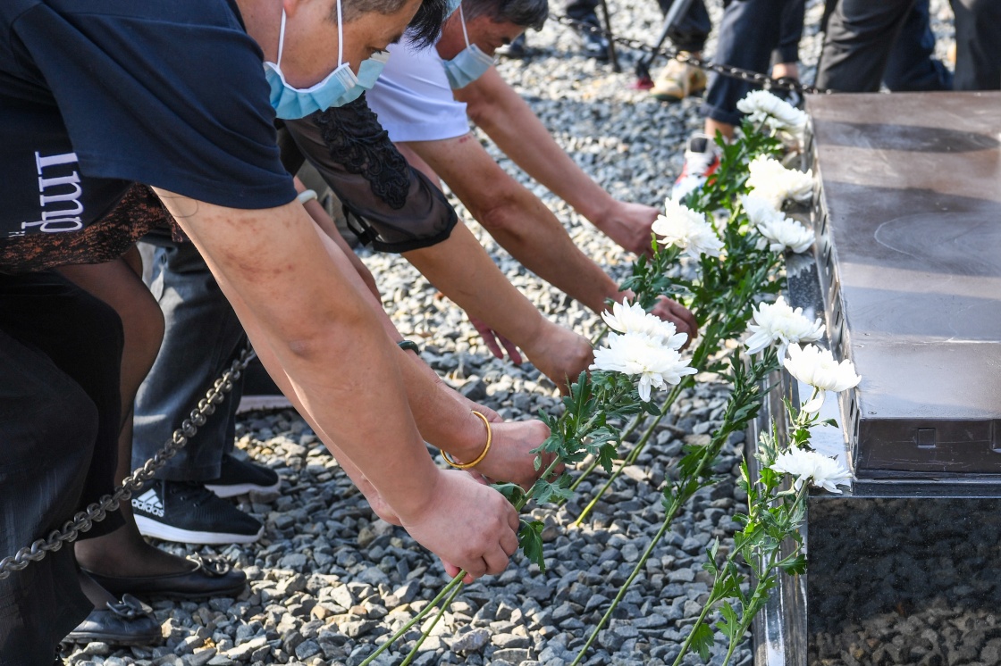9月18日,南京大屠殺幸存者后代代表在活動(dòng)中敬獻(xiàn)鮮花。
