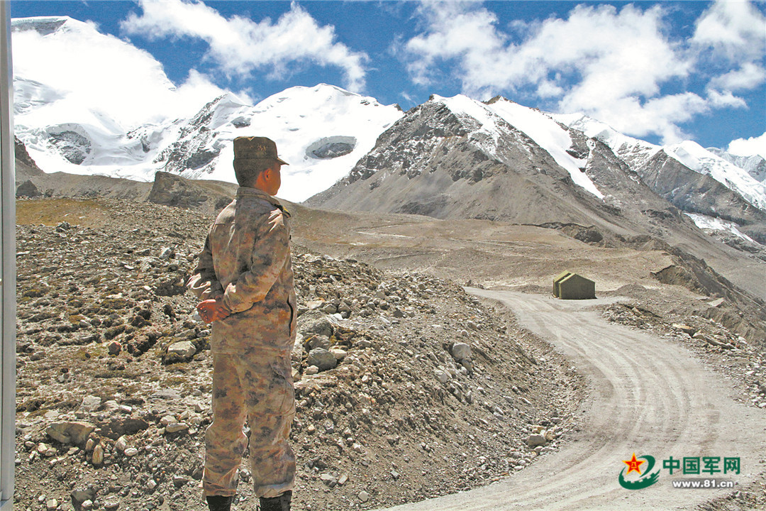 執(zhí)勤崗哨位于一片空地,遠(yuǎn)處是連綿雪山,再遠(yuǎn)一點(diǎn)的地方便是官兵每天凝視的邊防線。