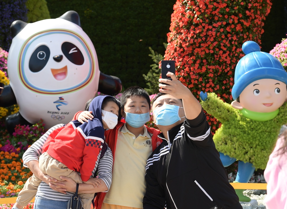 10月1日,人們在北京長安街西單路口“喜迎冬奧”主題花壇前拍照留影。新華社記者 李賀 攝