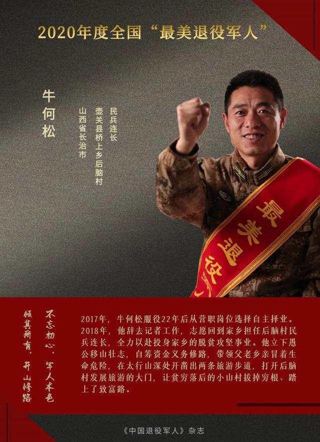 2017年,牛何松自主擇業(yè),雖然脫下軍裝,但他始終保持為黨分憂(yōu)、為國(guó)奉獻(xiàn)、為民服務(wù)的本色。2018年,他辭去記者工作,回到家鄉(xiāng)擔(dān)任后腦村民兵連長(zhǎng),全力以赴投身家鄉(xiāng)的脫貧攻堅(jiān)事業(yè)。他立下愚公移山壯志,自籌資金義務(wù)修路,帶領(lǐng)父老鄉(xiāng)親冒著生命危險(xiǎn),在太行山深處開(kāi)鑿出兩條旅游步道,打開(kāi)后腦村發(fā)展旅游的大門(mén),讓貧窮落后的小山村拔掉窮根,踏上了致富路。曾獲“全國(guó)道德模范提名獎(jiǎng)”,獲“全國(guó)擁政愛(ài)民模范”“全國(guó)模范退役軍人”等稱(chēng)號(hào)。