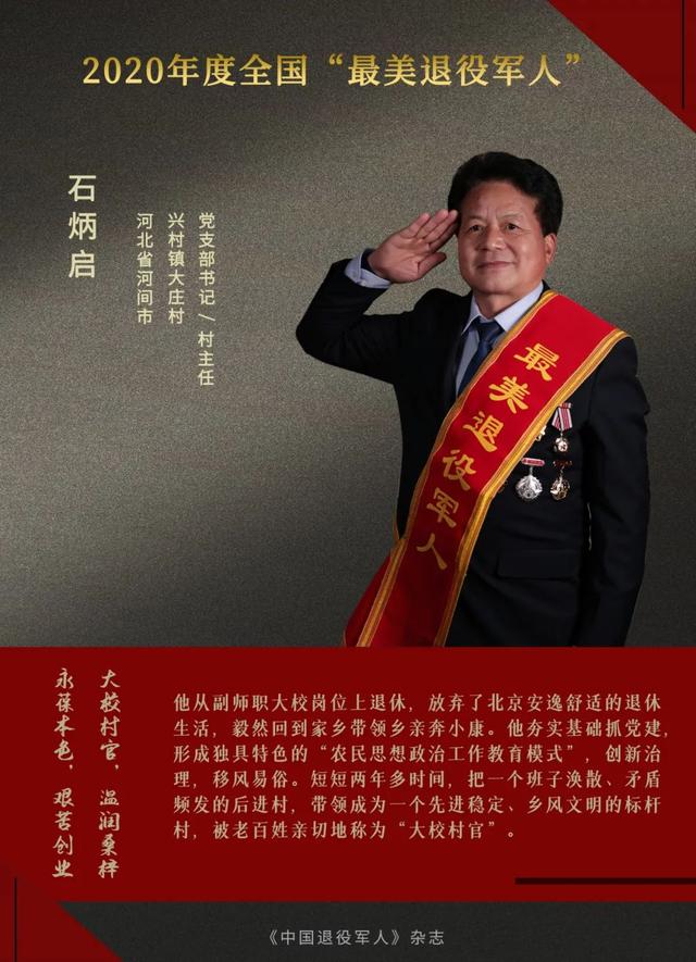 2015年,石炳啟從副師職崗位退休。2018年2月,他放棄北京安逸舒適的退休生活,毅然回到家鄉(xiāng)帶領(lǐng)鄉(xiāng)親奔小康。他夯實(shí)基礎(chǔ)抓黨建,形成獨(dú)具特色的“農(nóng)民思想政治工作教育模式”;針對村內(nèi)垃圾、道路積水、違規(guī)建筑等頑癥痼疾,建立20項(xiàng)村規(guī)民約整治村容村貌;以制止人情攀比、大操大辦等不良婚俗現(xiàn)象為突破口,探索村民自治管理新路,不斷推進(jìn)移風(fēng)易俗。短短2年多時(shí)間,把一個(gè)班子渙散、矛盾頻發(fā)的后進(jìn)村,帶領(lǐng)成為一個(gè)先進(jìn)穩(wěn)定、鄉(xiāng)風(fēng)文明的標(biāo)桿村,被老百姓親切地稱為“大校村官”。曾獲“全國模范退役軍人”稱號。