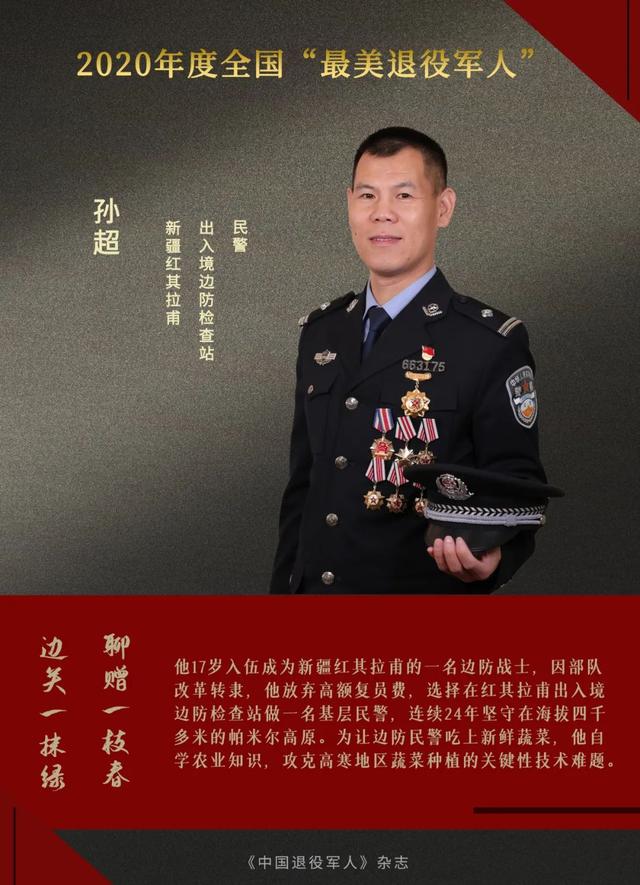 孫超17歲入伍來(lái)到武警新疆邊防總隊(duì)紅其拉甫邊檢站,因部隊(duì)改革轉(zhuǎn)隸,他選擇在紅其拉甫出入境邊防檢查站做一名基層民警,連續(xù)24年堅(jiān)守在海拔4000多米的帕米爾高原。為讓邊防民警吃上新鮮蔬菜,他自學(xué)農(nóng)業(yè)知識(shí),攻克高寒地區(qū)蔬菜種植的關(guān)鍵性技術(shù)難題,成功種植出36余種蔬菜,搭建8座蔬菜大棚,創(chuàng)造了“萬(wàn)仞冰峰、十畝江南”的綠色奇跡。他用全心全意為人民服務(wù)的赤子情懷,贏得駐地塔吉克族群眾的廣泛贊譽(yù),為新疆各族干部群眾作出了扎根邊疆、戍邊衛(wèi)國(guó)的榜樣,立起了新時(shí)代共產(chǎn)黨員“不忘初心、牢記使命”的旗幟標(biāo)桿。曾獲“全國(guó)模范退役軍人”“十大國(guó)門(mén)衛(wèi)士”等稱(chēng)號(hào)。
