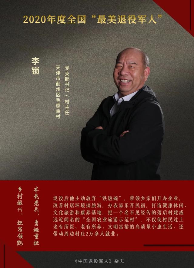 20年前,毛家峪村是個“光棍村”,李鎖退役后主動放棄“鐵飯碗”,帶領(lǐng)鄉(xiāng)親們開辦企業(yè),改善村居環(huán)境搞旅游,辦農(nóng)家樂開民宿,打造健康休閑、文化旅游和康養(yǎng)基地,把一個名不見經(jīng)傳的落后村建成了遠(yuǎn)近聞名的“全國鄉(xiāng)村旅游重點村”,不僅使村民過上老有所醫(yī)、老有所養(yǎng)、文明富裕的高質(zhì)量小康生活,還帶動周邊村莊2萬多人就業(yè)。曾獲“全國勞動模范”“中國鄉(xiāng)村旅游致富帶頭人”等稱號。