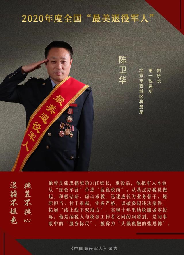 陳衛(wèi)華曾任張思德班第31任班長。退役后,他把“綠色軍營”的好思想、好作風(fēng)、好傳統(tǒng)帶進(jìn)“藍(lán)色稅崗”。他從基層辦稅員做起,積極鉆研、虛心求教,迅速成長為業(yè)務(wù)骨干。他履職擔(dān)當(dāng)、甘于奉獻(xiàn),嚴(yán)格審核每筆契稅業(yè)務(wù),樹規(guī)范鑄防線,識破多起違法案件;拓展“線上線下雙助力”,實(shí)現(xiàn)10年里納稅服務(wù)零投訴。疫情期間,他還積極探索分級分類服務(wù)模式,當(dāng)好“非接觸式”辦稅的踐行者。他是納稅人與稅務(wù)工作者之間的潤滑劑,是同事眼中的“服務(wù)標(biāo)尺”,被稱為“頭戴稅徽的張思德”。曾獲“首都五一勞動獎?wù)隆保@“首都勞動模范”稱號。