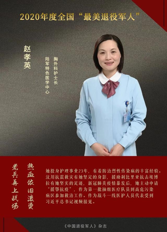 趙孝英 女,漢族,中共黨員,1979年出生,1994年入伍,2016年退役,陸軍特色醫(yī)學(xué)中心胸外科護士長