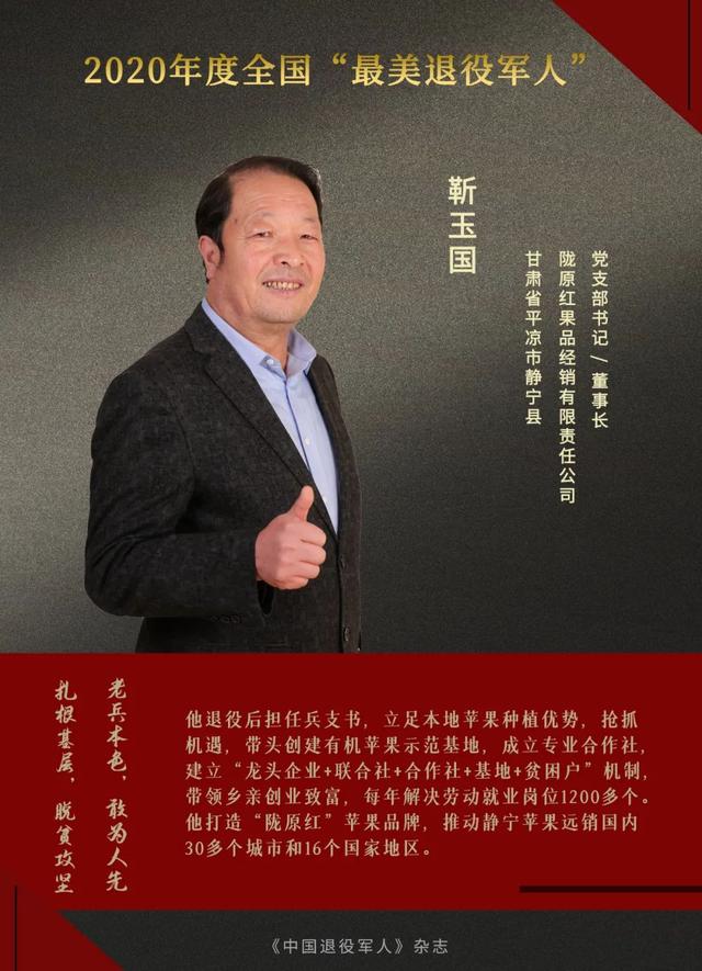 靳玉國退役后帶領(lǐng)鄉(xiāng)親創(chuàng)業(yè)致富。擔(dān)任村支書期間,他多處籌資,創(chuàng)辦木材經(jīng)銷站、地毯廠、磚瓦廠,讓全村300多人實(shí)現(xiàn)家門口就業(yè),所在村成為全市“10面紅旗村”之一。立足本地蘋果種植優(yōu)勢(shì),他搶抓機(jī)遇,帶頭創(chuàng)建有機(jī)蘋果示范基地,成立專業(yè)合作社,建立“龍頭企業(yè)+聯(lián)合社+合作社+基地+貧困戶”機(jī)制,每年解決勞動(dòng)就業(yè)崗位1200多個(gè)。他打造“隴原紅”蘋果品牌,增加產(chǎn)品附加值,增強(qiáng)市場(chǎng)競(jìng)爭力和知名度,推動(dòng)靜寧蘋果遠(yuǎn)銷國內(nèi)30多個(gè)城市和16個(gè)國家地區(qū)。曾獲“甘肅省十大杰出青年農(nóng)民”“隴原最美退役軍人”等稱號(hào)。