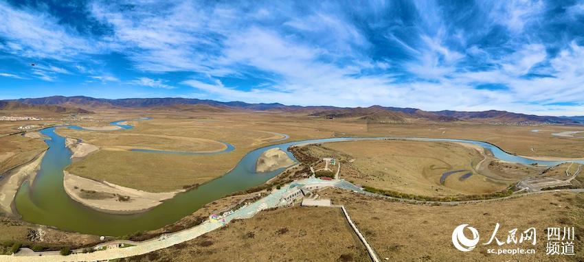 晶瑩剔透的白河,在深秋的紅原劃過(guò)一道優(yōu)美的弧線,仿佛一彎落在人間的新月,天藍(lán)云白、水碧地燦。這里,是國(guó)家4A級(jí)旅游景區(qū)、被《中國(guó)國(guó)家地理》評(píng)為“100個(gè)最美觀景拍攝點(diǎn)”之一的月亮灣。