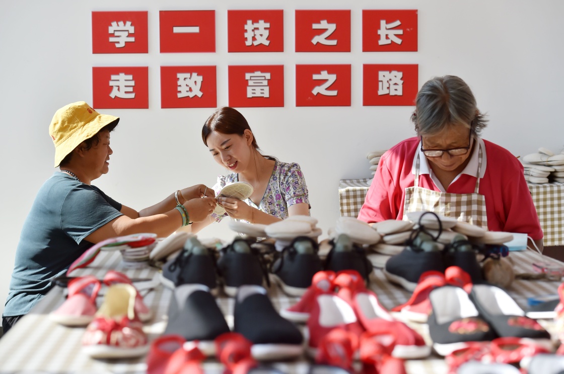 9月2日,在河北省平山縣北莊村的“團(tuán)結(jié)北莊手工坊”里,當(dāng)?shù)貗D女在縫制手工布鞋。新華社發(fā)(張曉峰 攝)