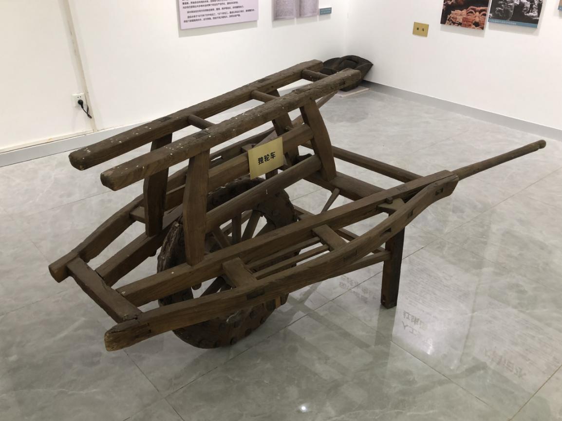 烏審旗水生態(tài)文明教育展示廳里擺放的當(dāng)年建造巴圖灣水庫(kù)時(shí)使用過(guò)的獨(dú)輪車。中國(guó)日?qǐng)?bào)網(wǎng)記者 萬(wàn)月英攝