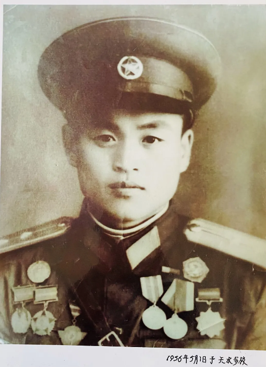 這張照片拍攝于1956年,是齊東升在天水步校學(xué)習(xí)時(shí)留下的影像。照片中,齊東升穿著一身軍裝,胸前掛滿了獎(jiǎng)?wù)拢浑y看出,那時(shí)的他英氣十足,功勛顯赫。