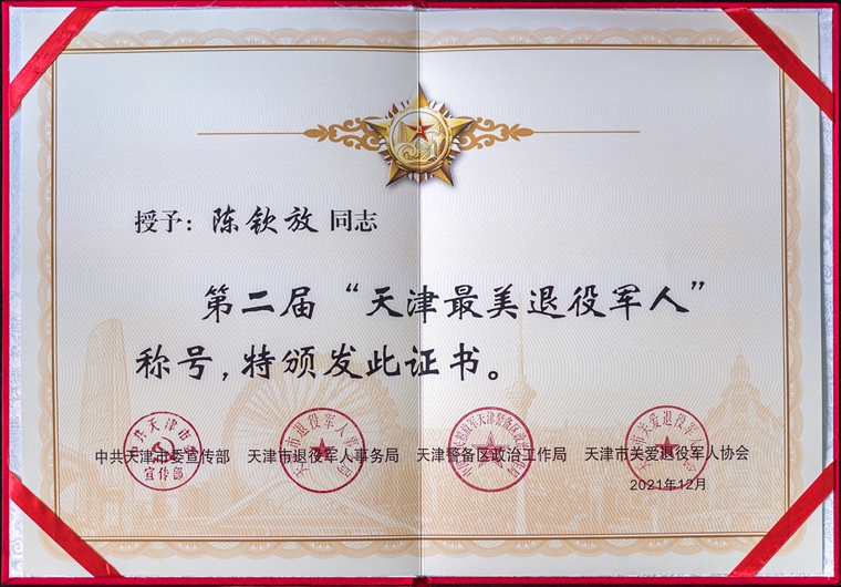 退役后,憑著“干就要干出個(gè)樣子來(lái)”的創(chuàng)業(yè)精神,陳欽放成立了天津飛豪文化傳媒有限公司,專門(mén)從事軍隊(duì)和政府部門(mén)的宣傳片拍攝與制作工作。他和團(tuán)隊(duì)創(chuàng)作的影像作品多次獲獎(jiǎng)。其中,微電影《洋河老張》榮獲第二屆亞洲48小時(shí)極拍比賽最佳元素設(shè)計(jì)獎(jiǎng);微電影《回聲》榮獲第三屆亞洲48小時(shí)極拍比賽最佳剪輯獎(jiǎng),榮獲第五屆中國(guó)國(guó)際微電影展“十佳城市微電影”。2021年7月,陳欽放被評(píng)為和平區(qū)第三屆“最美退役軍人”;2021年12月,評(píng)為第二屆“天津最美退役軍人”。