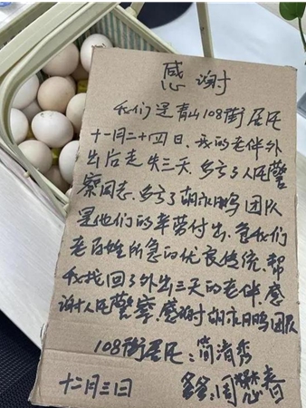 “千言萬語也表達不了我的感謝。”12月6日清早,周大爺?shù)睦习楹喥牌艓е胰粟s到派出所堵住胡永鵬,非要將一筐土雞蛋和一封寫在硬紙板上的感謝信塞給他。