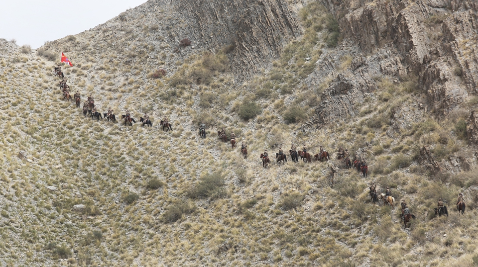 “從騎兵連成立至今,每到春秋兩季,轉(zhuǎn)場路上都活躍著騎兵連護(hù)送牧民和牛羊的身影?!蓖聽栠d驕傲地說到。在一次秋季轉(zhuǎn)場時,有民兵發(fā)現(xiàn)一支5、6只狼組成的狼群一直跟著羊群,還叼走了幾只落單的羔羊。吐爾遜立即將騎兵連分成兩組,由副連長帶領(lǐng)一組抓緊加固臨時羊圈,自己帶領(lǐng)另一組沖向尾隨的狼群,直至將狼群驅(qū)趕出30公里開外,在保證羊群絕對安全后才返回。正是騎兵連年復(fù)一年的周全守護(hù),才讓牧民們能踏踏實實走過50多個春秋的轉(zhuǎn)場路。