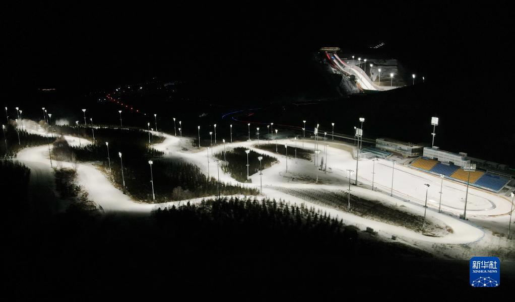 這是張家口賽區(qū)國(guó)家越野滑雪中心(下)與國(guó)家跳臺(tái)滑雪中心(上)夜景(2021年2月30日無(wú)人機(jī)照片)。新華社記者 楊世堯 攝