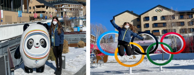 △圖為巴西代表團自由式滑雪運動員薩布麗娜·卡斯在北京冬奧村拍照留念
