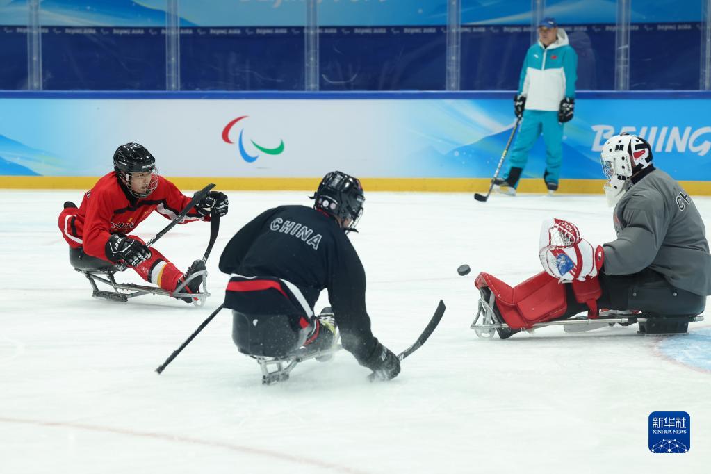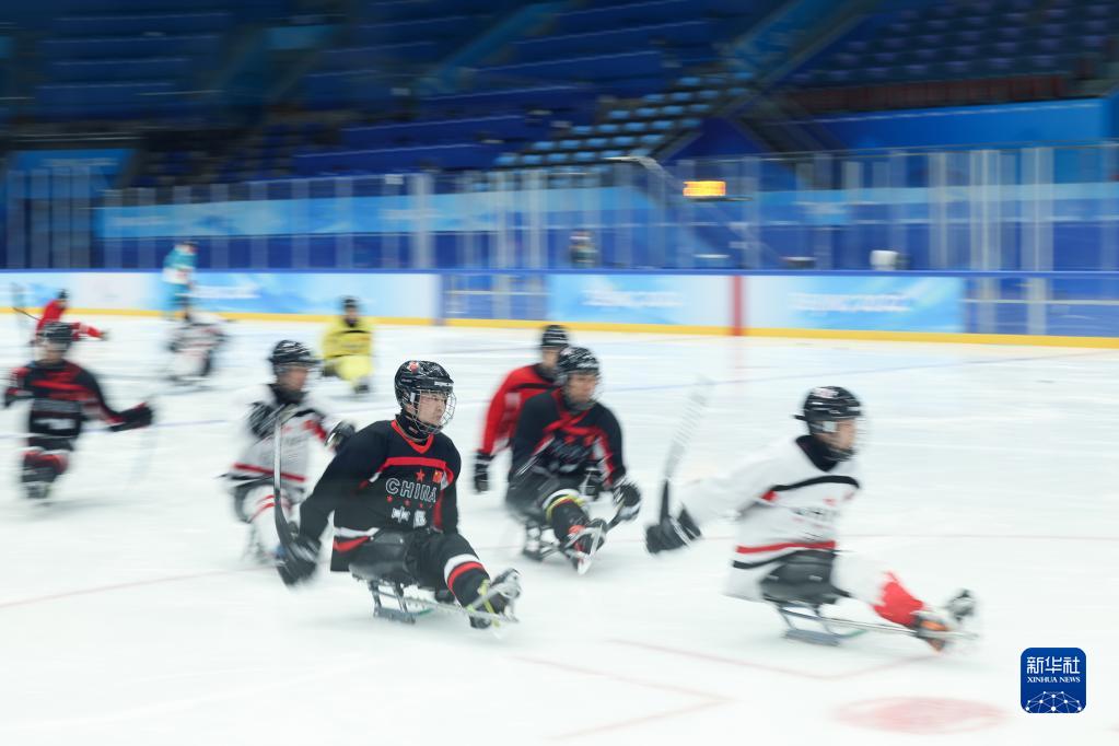 3月1日,中國(guó)殘奧冰球隊(duì)在訓(xùn)練中。當(dāng)日,中國(guó)殘奧冰球隊(duì)在國(guó)家體育館訓(xùn)練,備戰(zhàn)北京冬殘奧會(huì)。新華社記者 張可任 攝