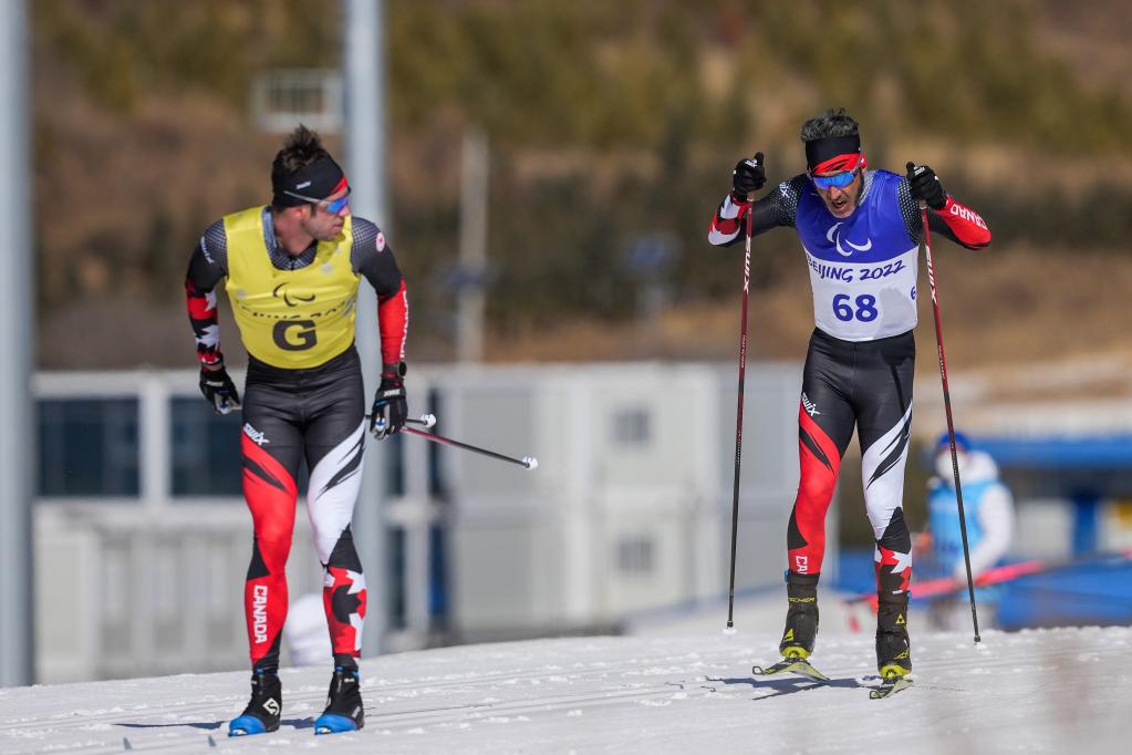 3月7日,加拿大選手布賴(lài)恩·麥基弗(右)和他的向?qū)Я_素·肯尼迪在北京2022年冬殘奧會(huì)越野滑雪男子長(zhǎng)距離經(jīng)典視力障礙比賽中。新華社記者胡超攝