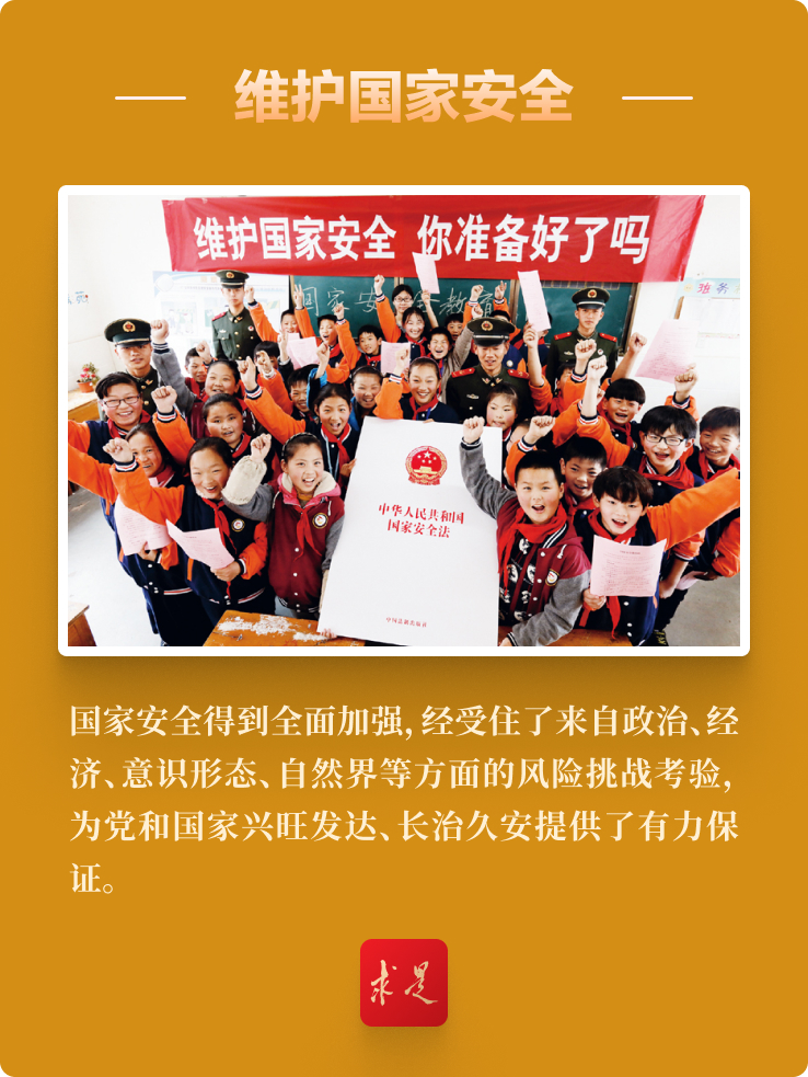 ——黨把安全發(fā)展貫穿國家發(fā)展各領(lǐng)域全過程,注重防范化解影響我國現(xiàn)代化進(jìn)程的重大風(fēng)險(xiǎn),堅(jiān)定維護(hù)國家政權(quán)安全、制度安全、意識(shí)形態(tài)安全,加強(qiáng)國家安全宣傳教育和全民國防教育,鞏固國家安全人民防線,推進(jìn)興邊富民、穩(wěn)邊固邊,嚴(yán)密防范和嚴(yán)厲打擊敵對(duì)勢(shì)力滲透、破壞、顛覆、分裂活動(dòng),頂住和反擊外部極端打壓遏制,開展涉港、涉臺(tái)、涉疆、涉藏、涉海等斗爭,加快建設(shè)海洋強(qiáng)國,有效維護(hù)國家安全。