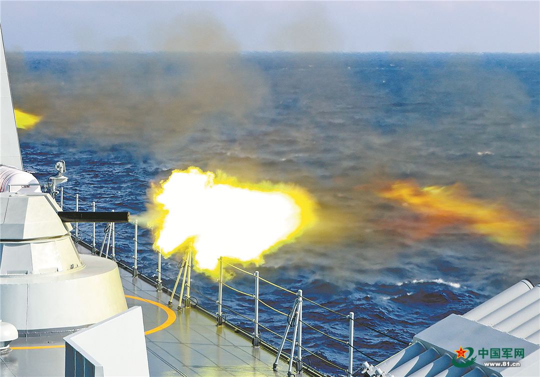 “發(fā)現(xiàn)‘敵’目標!”戰(zhàn)斗警報拉響后,作戰(zhàn)指揮室各戰(zhàn)位號手緊張忙碌,電子海圖和雷達屏幕上目標參數(shù)變換閃爍。目標進入主炮射程后,指揮員果斷下達射擊命令。頃刻間,炮聲隆隆,海面騰起數(shù)米高的水柱。